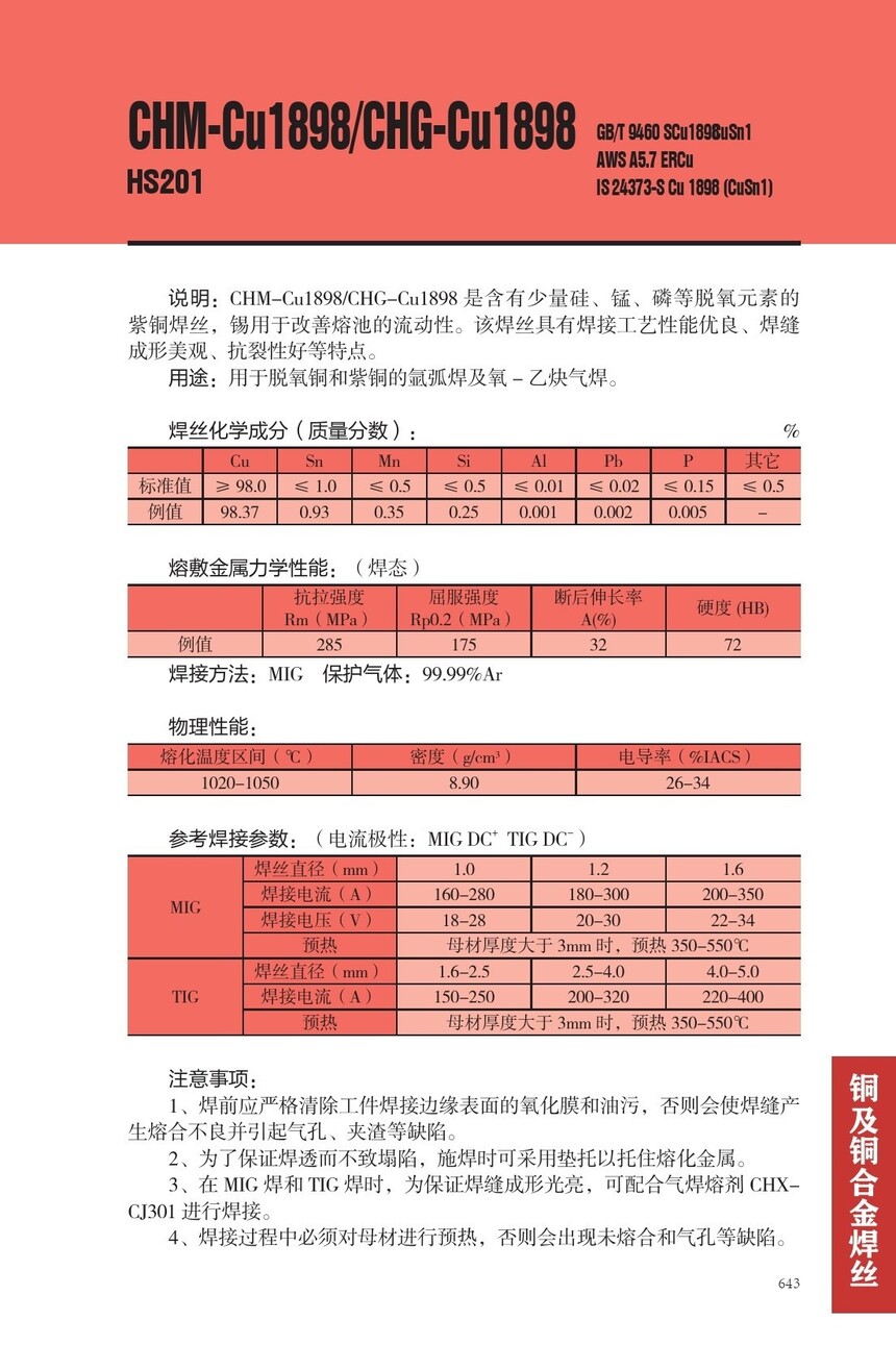 CHM-Cu1898铜焊丝CHG-Cu1898焊丝HS201