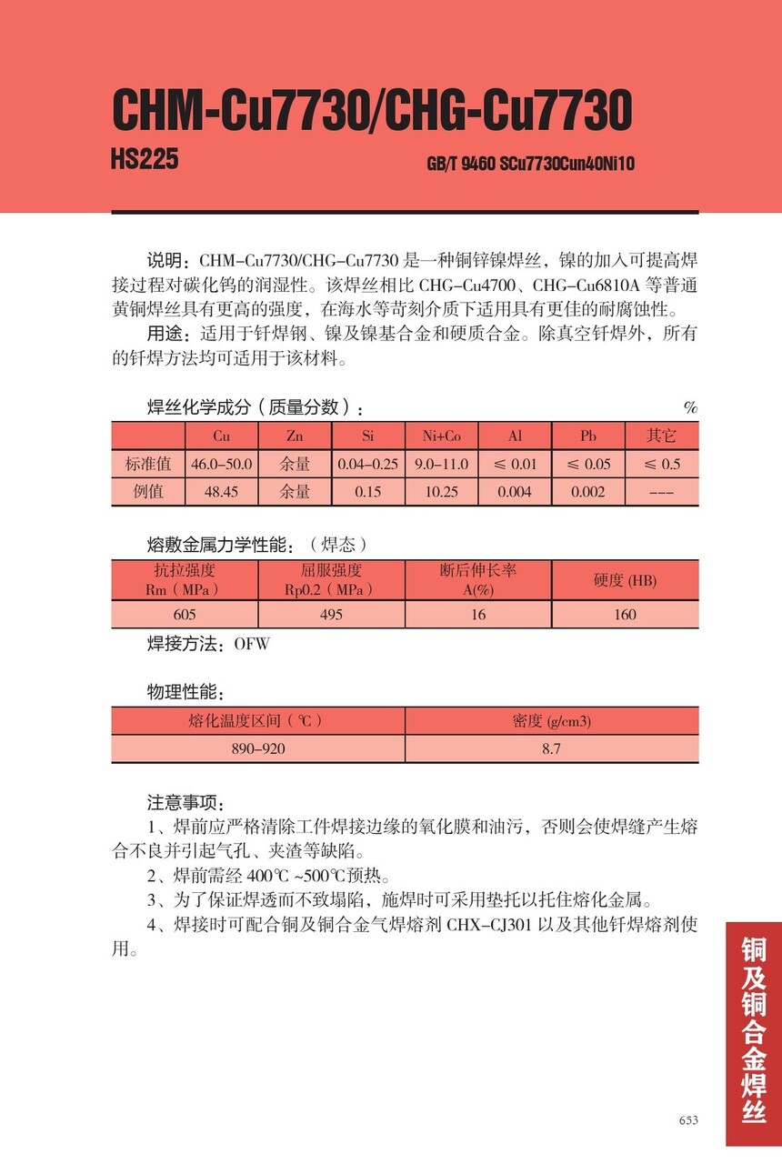CHM-Cu7730铜焊丝CHG-Cu7730铜锌镍焊丝